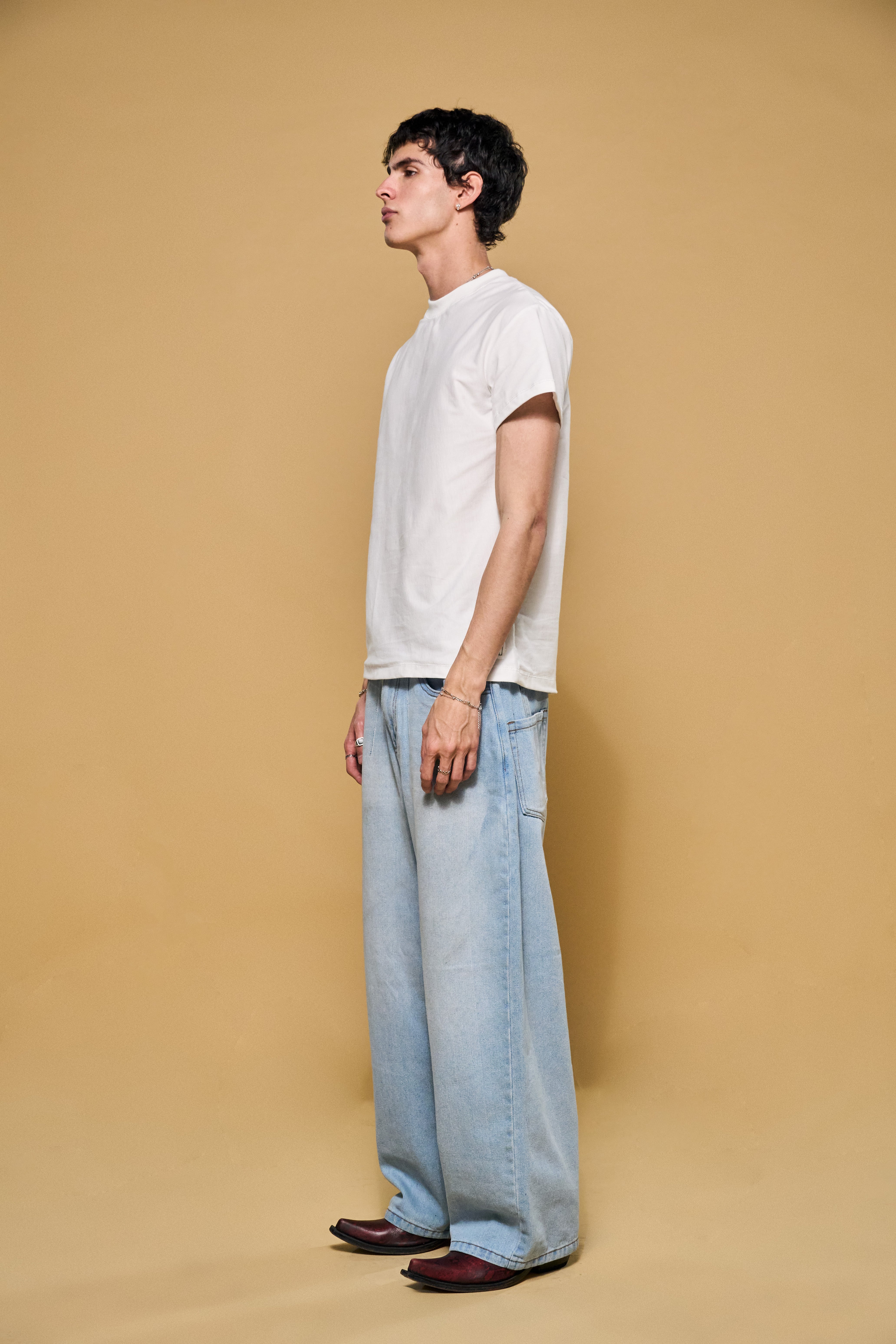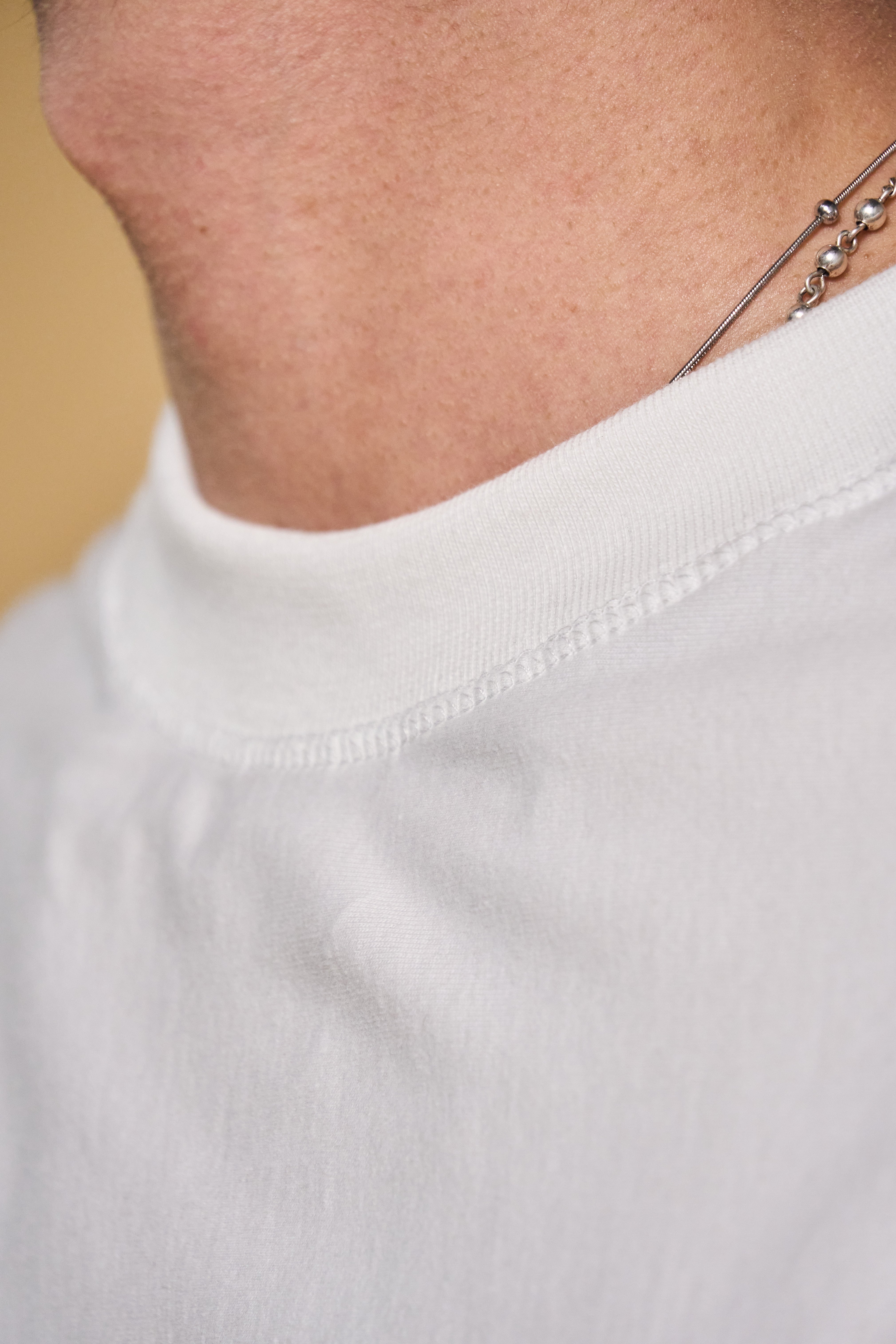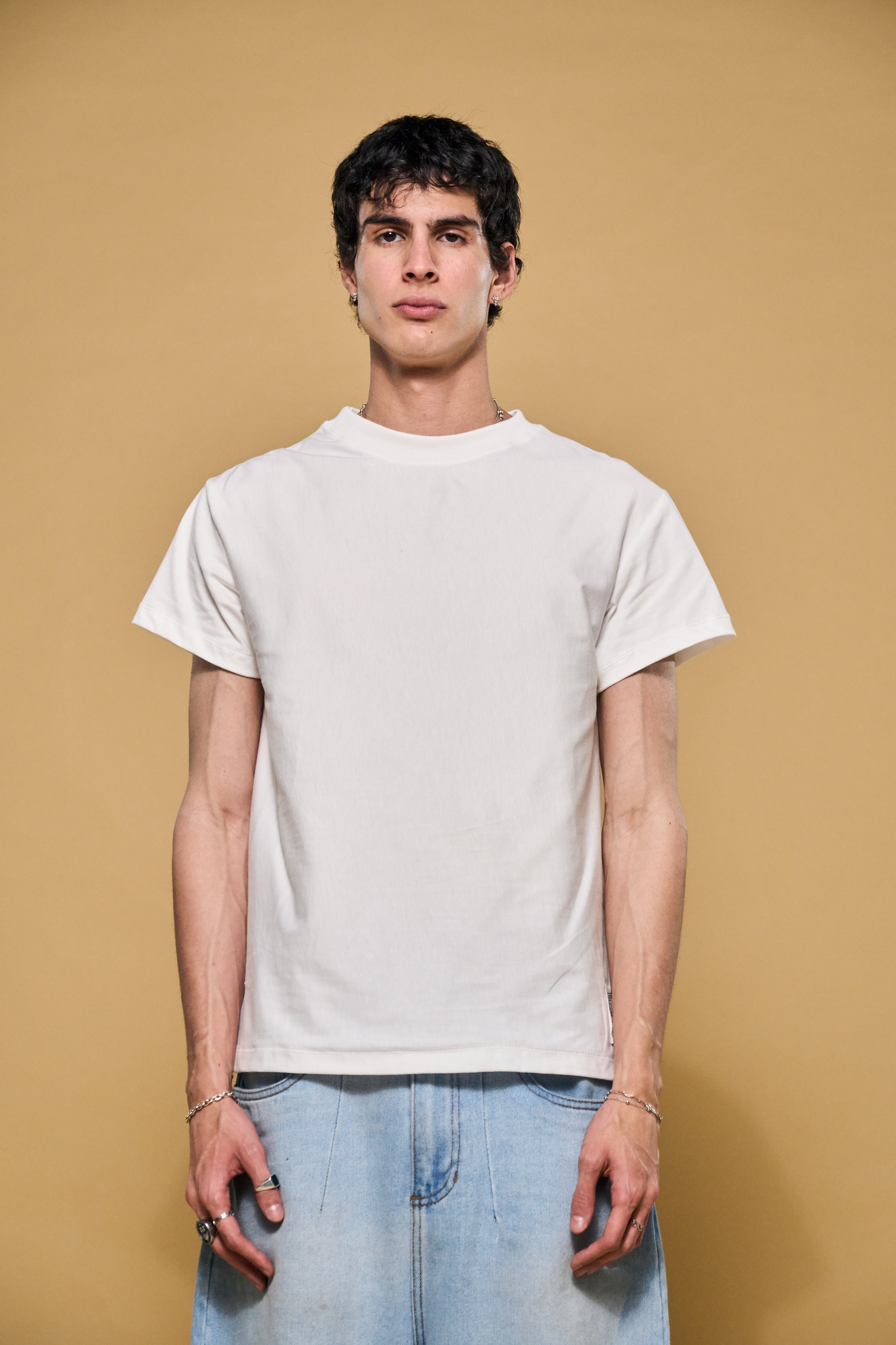 La estructura perfecta. Esta pieza en 100% algodón de 200gsm ha sido diseñada para sostener una silueta rígida y un volumen que no cede. Con hombros caídos y un corte boxy impecable, elimina lo innecesario para centrarse exclusivamente en la fuerza de la materia. Un básico elevado a objeto de diseño.