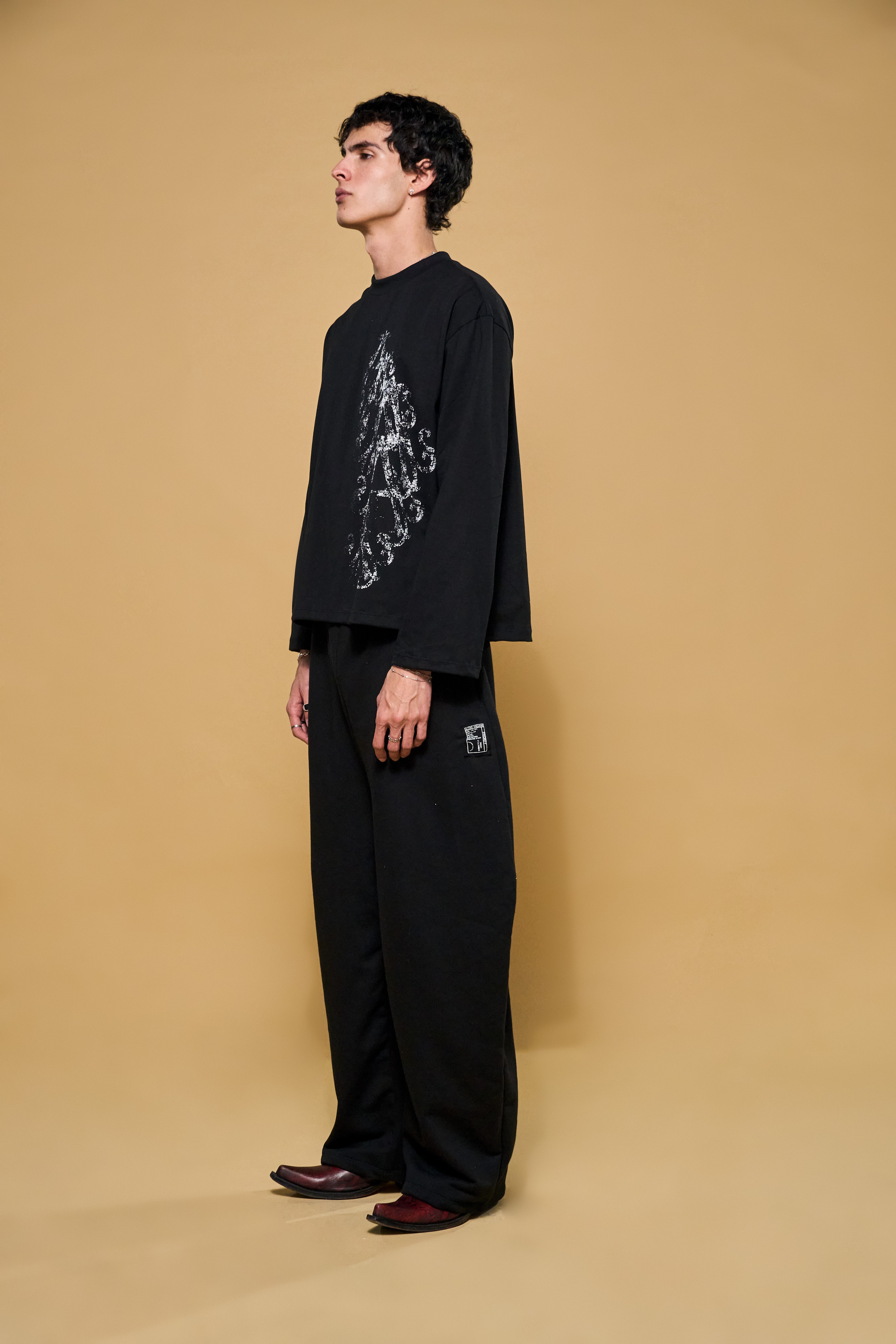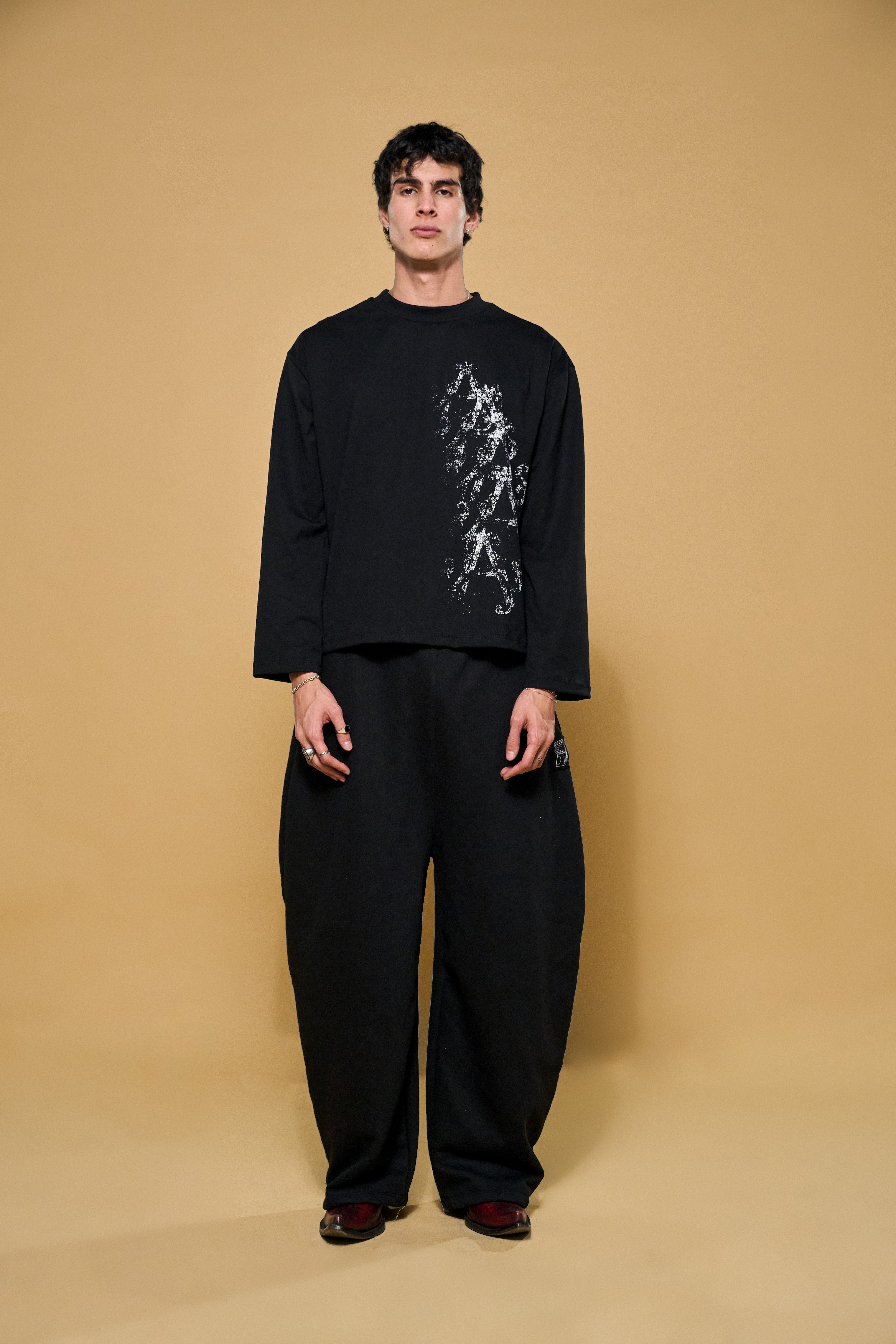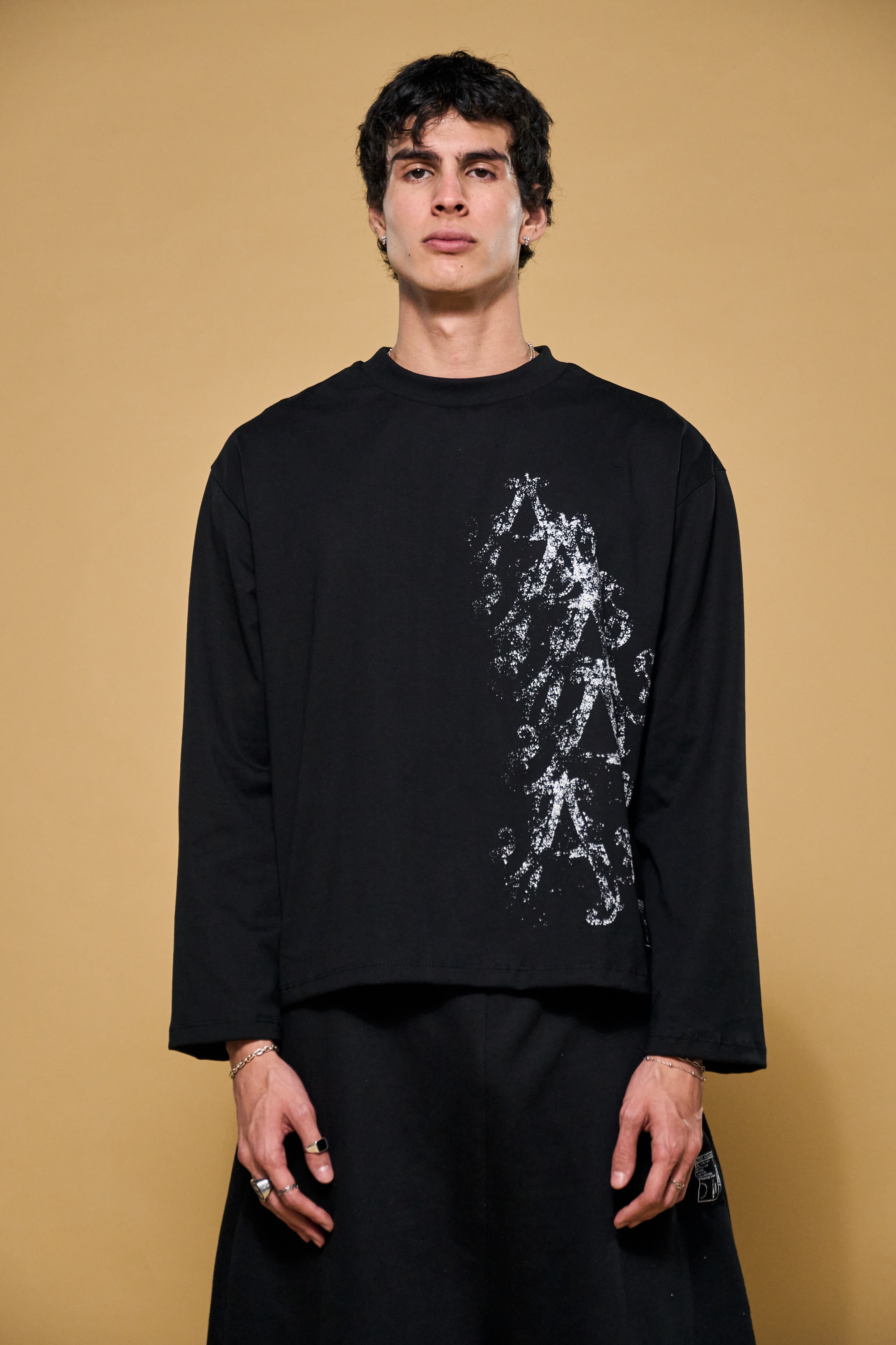 La estructura perfecta. Esta pieza en 100% algodón de 200gsm ha sido diseñada para sostener una silueta rígida y un volumen que no cede. Con hombros caídos y un corte boxy impecable, elimina lo innecesario para centrarse exclusivamente en la fuerza de la materia. Un básico elevado a objeto de diseño.
