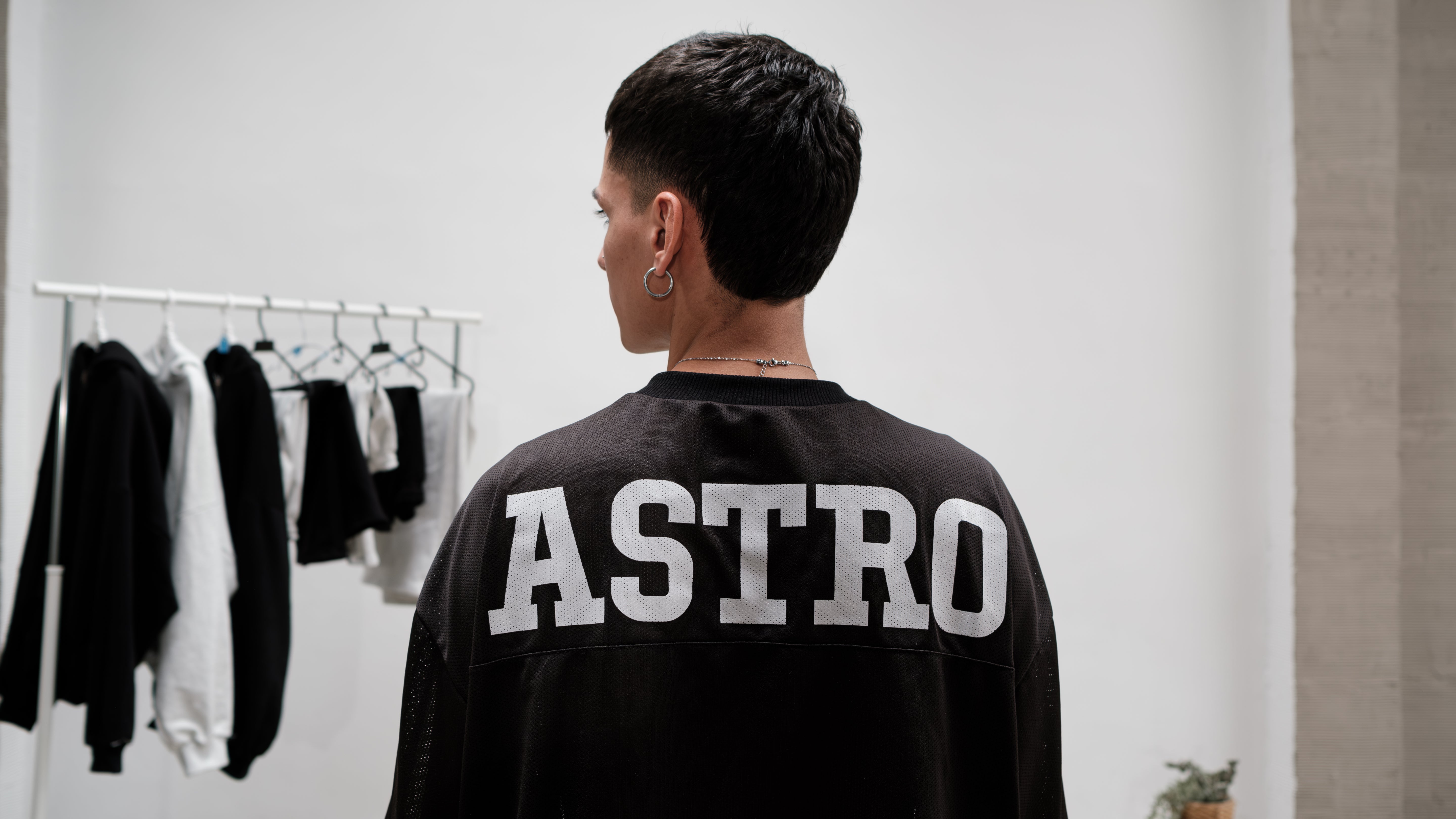Jersey de malla atlética de corte boxy. Serigrafía con logotipos de Astro en la parte delantera y trasera.